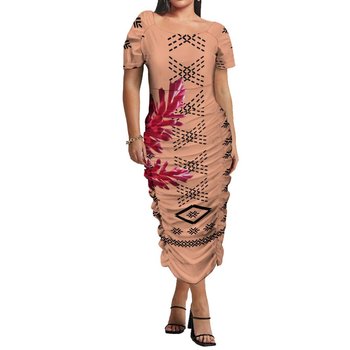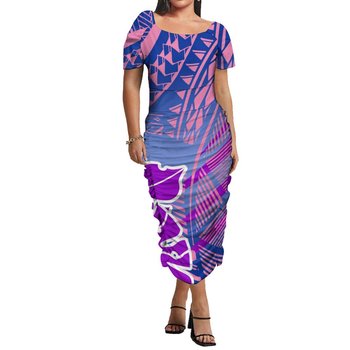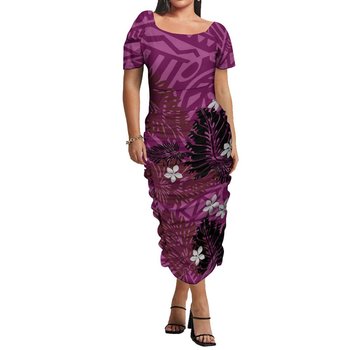 Wholesale Custom Polynesian Hawaii Tribal Printed Big Size Women Island Dresses Slim Fit Pleated Bodycon Dresses 5Xl 6Xl 7Xl 8Xl